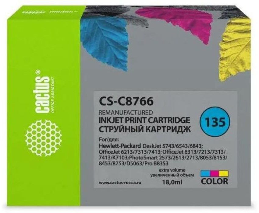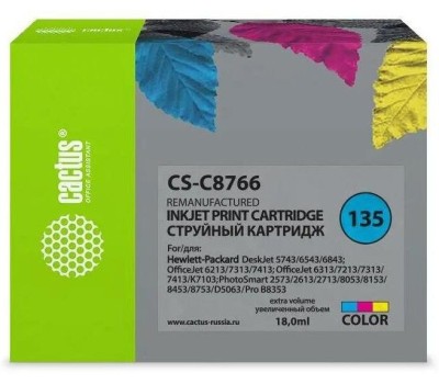 CACTUS Картридж струйный CS-C8766 №135 многоцветный (18мл) для HP DJ 5743/6543/6843/DJ 6213/7313/7413/6313/7213/7313/7413/K7103/PS 2573/2613/2713/8053/8153/8453/8753/D5063/Pro B8353 с чипом