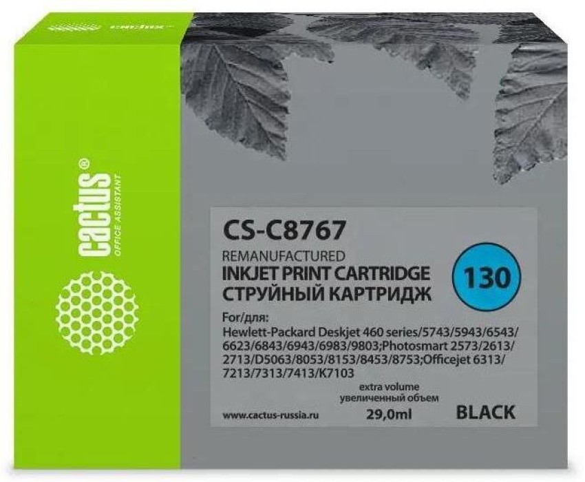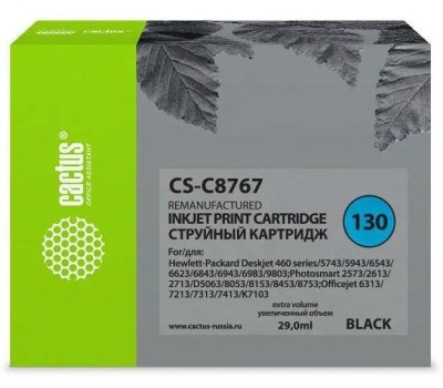 CACTUS Картридж струйный CS-C8767 №130 черный (29мл) для HP DJ 5740/5743/5745/5748/5793/5940/5943/6540/6540d/6540dt/6543/6543d/6620/6623/6840/6843/6940/6940dt/6943/6980series/6980dt/6983/6985/9800series/9860/DJ 6310/6310xi/6313/6315/6318 с чипом