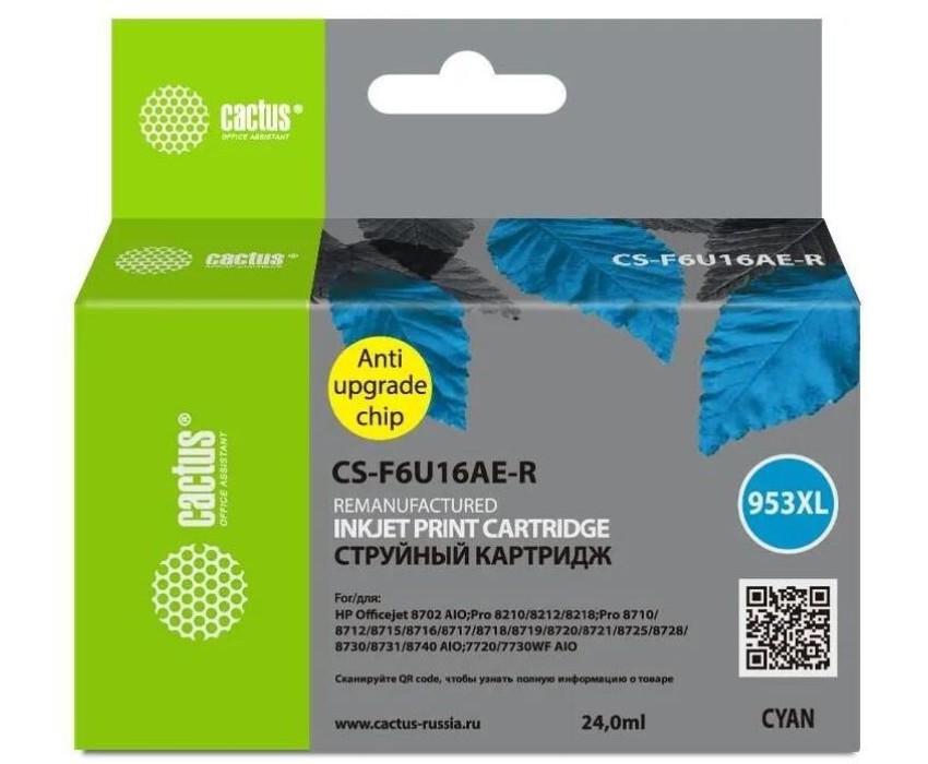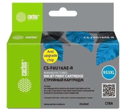 CACTUS Картридж струйный CS-F6U16AE-R 953XL голубой (24мл) для HP OJ Pro 7740/8210/8218/8710/8715 с чипом