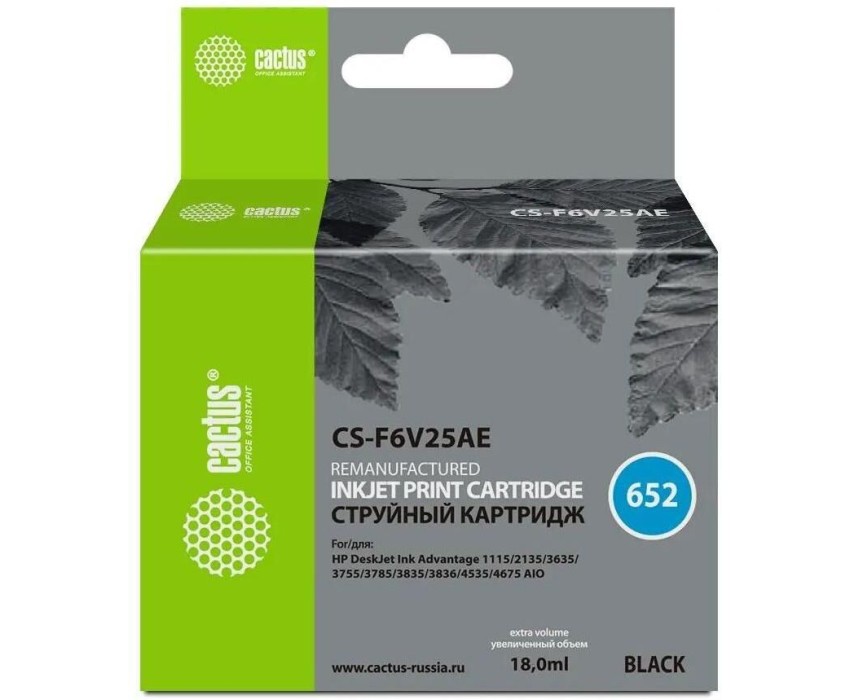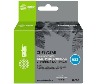 CACTUS Картридж струйный CS-F6V25AE 652 черный (480стр.) (18мл) для HP DeskJet Ink Advantage 1115/2135/3635 с чипом
