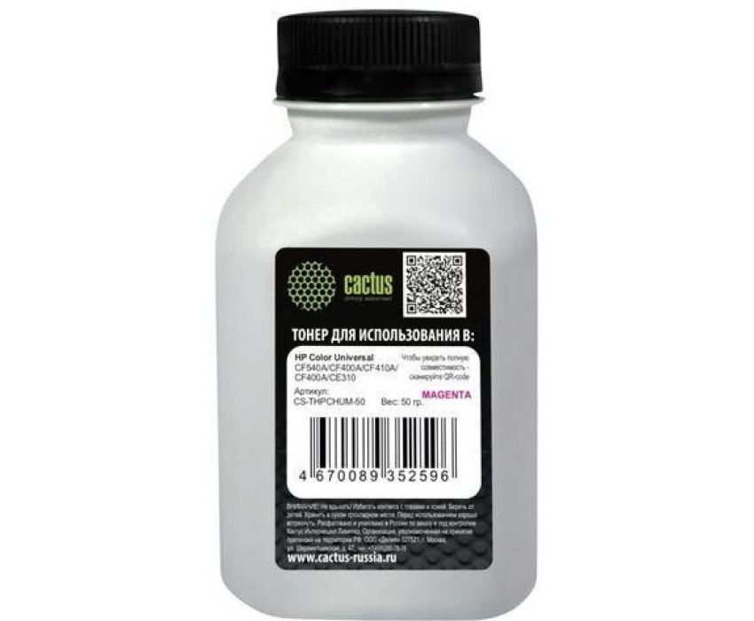 Тонер CACTUS Тонер CS-THPCHUM-50, для HP Color Universal CF540A/CF400A/CF410A/CF400A/CE310, пурпурный, 50грамм, флакон