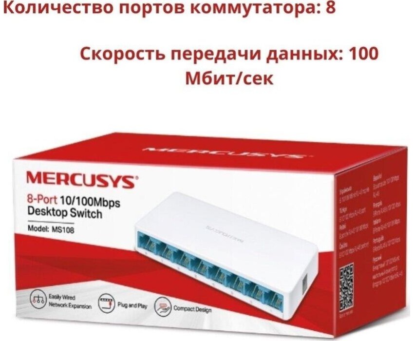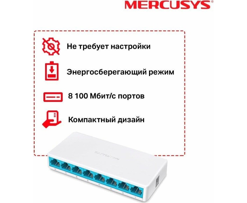 неуправляемый, настольный, порты 10-100Base-TX: 8 портов 10/100/1000 Мбит/с (RJ45) с автосогласованием и поддержкой Auto MDI/MDIX. Коммутатор Mercusys MS108 с легкостью объединит до 8 устройств с поддержкой сети 10/100 Мбит/сек в вашу локальную сеть. Он поддерживает стандарты: IEEE 802.3, IEEE 802.3u, IEEE 802.3x. Модель Mercusys MS108 имеет размеры 127x60x22 мм.
