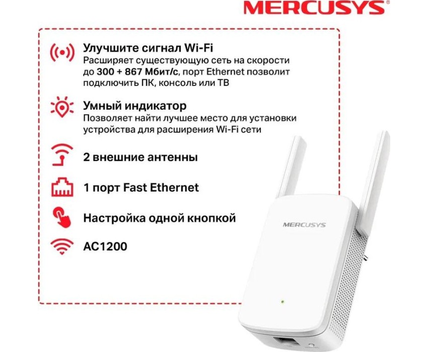 Wi-Fi усилитель сигнала, 2.4/5 ГГц, стандарт Wi-Fi: 802.11ac, максимальная скорость: 1167 Мбит/с, скорость портов: 100 Мбит/сек. Повторитель беспроводного сигнала Mercusys ME30 имеет 2 антенны. Это вариант с большим количеством «слепых зон» в любых типах помещений, с низким уровнем сигнала Wi-Fi, или как вариант расширения дальности работы. Повторитель беспроводного сигнала Mercusys ME30 быстро подключается к любому устройству, имеющему доступ в интернет, используя кнопку WPS