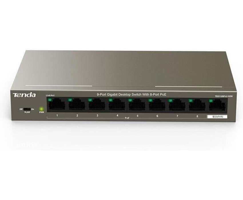 Tenda TEG1109P-8-102W Коммутатор неуправляемый PoE, 9 портов, 9x1 Гбит/с, PoE 8х92 Вт, настольный