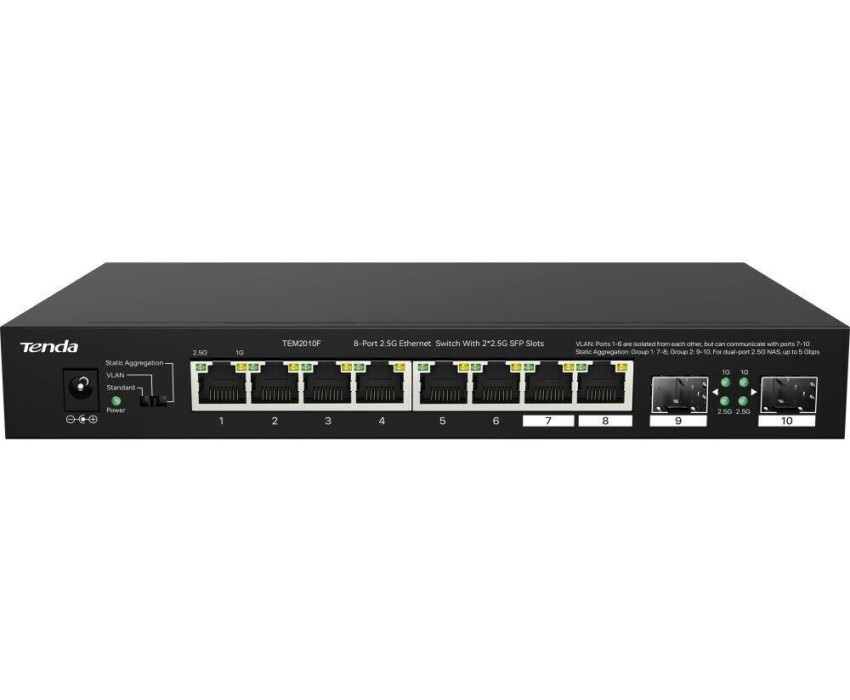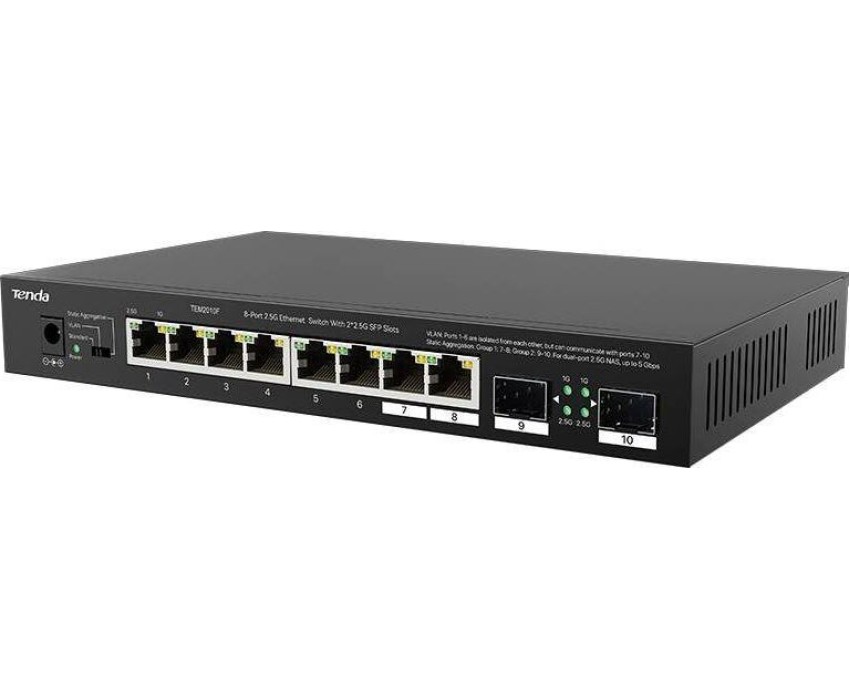 Tenda TEM2010F Коммутатор неуправляемый, 10 портов, 10x1 Гбит/с, RJ-45 8х2,5 Гбит/с, SFP 2х2,5 Гбит/с, настольный, метал