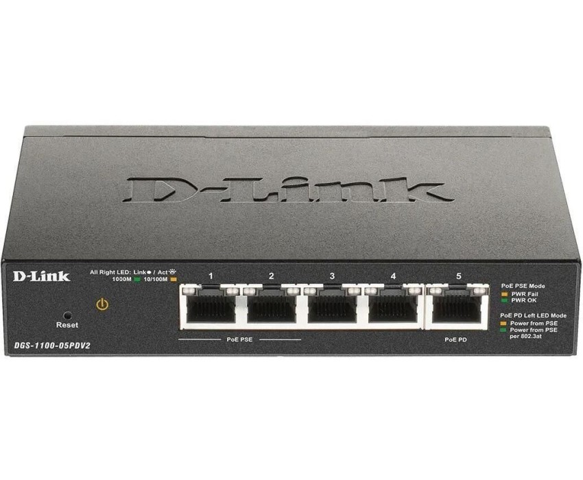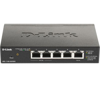 Коммутатор D-LINK DGS-1100-05PDV2/A1A Настраиваемый L2 с 5 портами 10/100/1000Base-T (2 порта PoE, 1 порт для питания коммутатора по PoE). Питание осу