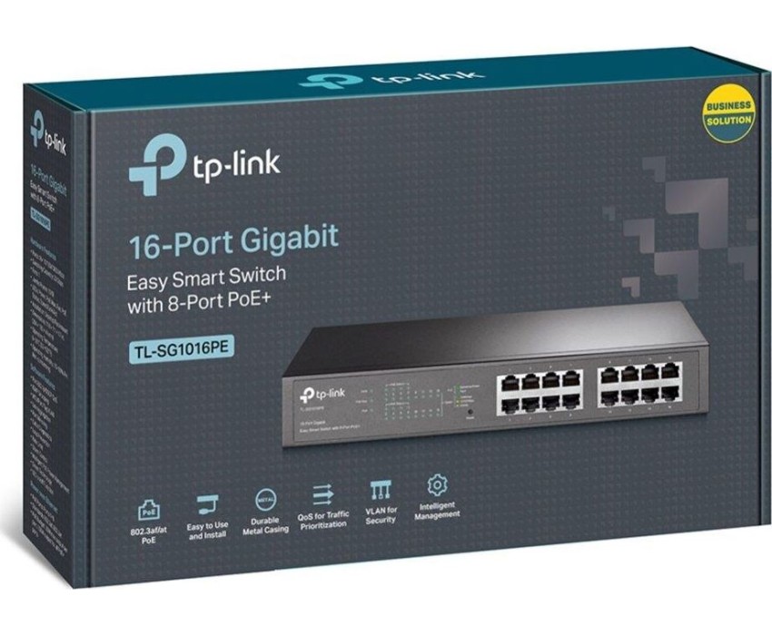 Easy Smart гигабитный 16-портовый коммутатор с 8 портами PoE+ 16 портов 10/100/1000 Мбит/с (RJ45) 8 портов PoE+, обеспечивающих передачу данных и питания по одному кабелю Общий бюджет PoE в 110 Вт, до 30 Вт на порт Работает с устройствами, поддерживающими IEEE 802.3af/at, для расширения домашней и офисной сети Простая настройка сети благодаря поддержке Plug-and-Play Простая настройка с помощью веб-интерфейса и утилиты настройки Easy Smart Предназначение устройства TL-SG1016PE – это 16-портовый