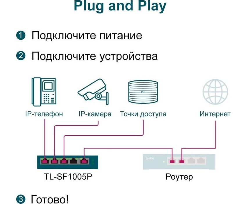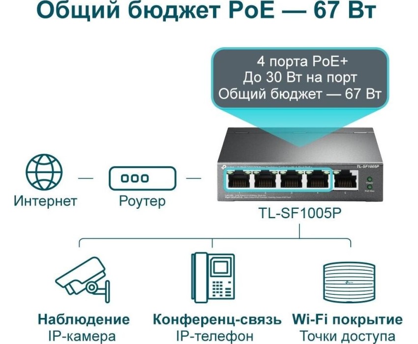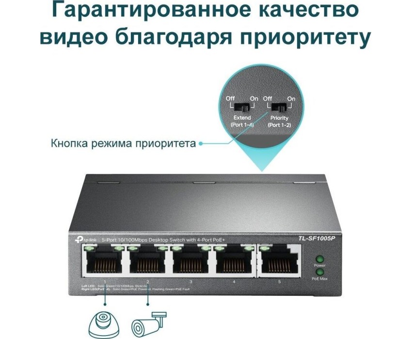 Коммутатор TP-LINK TL-SF1005P – простое и компактное устройство. Он рекомендован для применения в небольших офисах или дома. Способов для установки у коммутатора два – настольный или настенный, а вы выберете оптимальный вариант для его размещения. Одно из преимуществ коммутатора TP-LINK TL-SF1005P – поддержка PoE. Некоторые подключаемые к подобному оборудованию устройства нуждаются в подаче питания. Благодаря PoE вам не надо проводить для них отдельный кабель для обеспечения необходимой энергией.