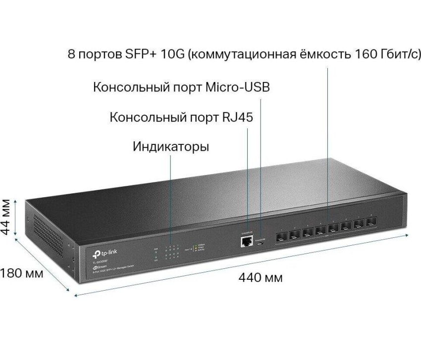 Тип: управляемый. Порты SFP+: 8. Исполнение: внутреннее. Материал корпуса: металл. Уровень коммутатора: L2+. Габариты упаковки (ед) ДхШхВ: 0.53x0.25x0.09. Вес упаковки (ед): 1.4. Комплектация: Коммутатор TL-SX3008F, Кабель питания, Руководство по настройке, Комплект для монтажа в стойку, Резиновые ножки. Базовая скорость передачи данных: 10000 Мбит/с. Внутренняя пропускная способность: 160 Гбит/сек. Пересылка пакетов: 119.04. Гарантия: 36 мес.. Размеры: 440x180x44мм. Таблица MAC-адресов: 32K. Особенности: Интеграция с Omada SDN: автоматическая настройка параметров (ZTP), централизованное облачное управление и умный мониторинг; Статическая маршрутизация: регулирование внутреннего трафика для более эффективного использования сетевых ресурсов. Надёжная защита: привязка IP?MAC?порт, список управления доступом (ACL), безопасность портов, защита от DoS?атак, защита от широковещательных штормов, DHCP Snooping, 802.1X, аутентификация RADIUS и другое. Интерфейсы и управление: WEB-интерфейс управления, облачное управление, поддержка CLI, поддержка Telnet. Установка: возможен монтаж в 19" стойку. Тип: управляемый, возможен монтаж в 19" стойку, L2+. Таблица MAC-адресов: 32K. Исполнение: внутреннее; материал корпуса: металл. Порты: SFP+ 8шт. Интерфейсы и управление: WEB-интерфейс управления, облачное управление, поддержка CLI, поддержка Telnet