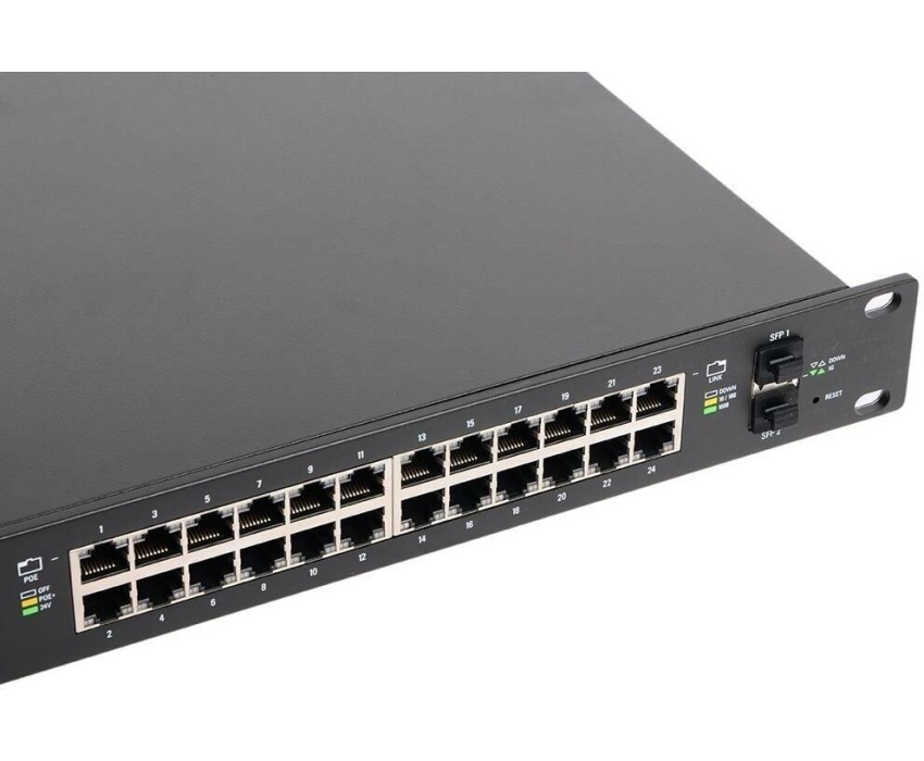 Тип: управляемый. Вес товара: 4.7. Порты PoE+: 24. PoE бюджет: 250. Исполнение: внутреннее. Материал корпуса: металл. Уровень коммутатора: L3. Габариты упаковки (ед) ДхШхВ: 0.57x0.33x0.08. Вес упаковки (ед): 5.6. Базовая скорость передачи данных: 10/100/1000 Мбит/с. Внутренняя пропускная способность: 26 Гбит/сек. Сетевые стандарты: 802.1ab (Link Layer Discovery Protocol), 802.1d (Spanning Tree Protocol), 802.1p (QoS), 802.1Q (VLAN), 802.1s (MSTP), 802.1w (RSTP), 802.1x (User Authentication), 802.3 (Ethernet), 802.3ab (1000BASE-T), 802.3ac (VLAN Tagging), 802.3ad (LACP), 802.3x (Flow Control). Страна производства: Китай. Входное напряжение (макс): 240. Входное напряжение (мин): 100. Частота электросети: 50 - 60 Гц. Пересылка пакетов: 38.69. Температура эксплуатации: от -5 до +40. Гарантия: 12 мес.. Порты 10-100-1000Base-T (Gigabit Ethernet): 24 шт.. Порты SFP: 2. Размеры: 485x285x44мм. Интерфейсы и управление: WEB-интерфейс управления, поддержка Telnet. Установка: возможен монтаж в 19" стойку. Порты: 10/100/1000BASE-T 24 шт., SFP 2шт. Интерфейсы и управление: WEB-интерфейс управления, поддержка Telnet. Тип: управляемый, возможен монтаж в 19" стойку, L3. Исполнение: внутреннее; материал корпуса: металл. Поддержка PoE: портов PoE+ 24шт, PoE бюджет 250 Вт