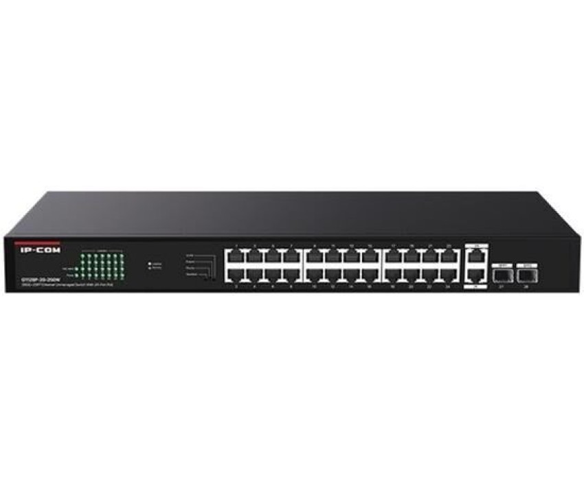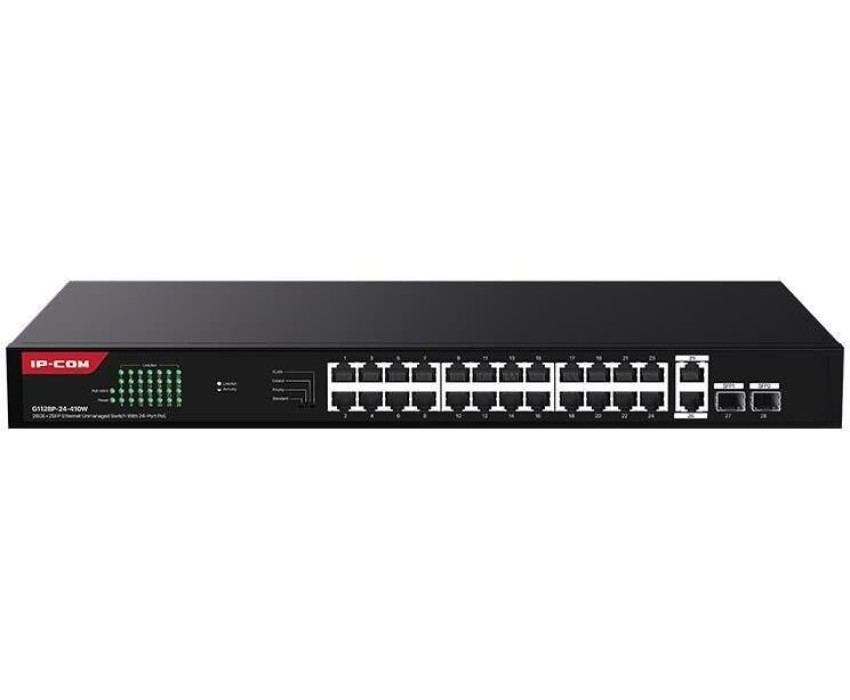 G1128P-24-410W Неуправляемый гигабитный PoE коммутатор Ethernet 26GE+2SFP с 24 портами PoE Соответствует стандартам и порта Ethernet 10/100/1000 Base-T (данные/питание)2 порта Ethernet 10/100/1000 Base-T (данные)2 оптических порта 100/1000 Base-X SFP8K MAC-адресов, автоматическое изучение MAC-адресовIEEE полнодуплексное управление потоком и полудуплексное регулирование потока с обратным давлениемКоммутационная матрица 56 Гбит/с для неблокирующей пересылки на высокой скоростиМаксимальная выходная