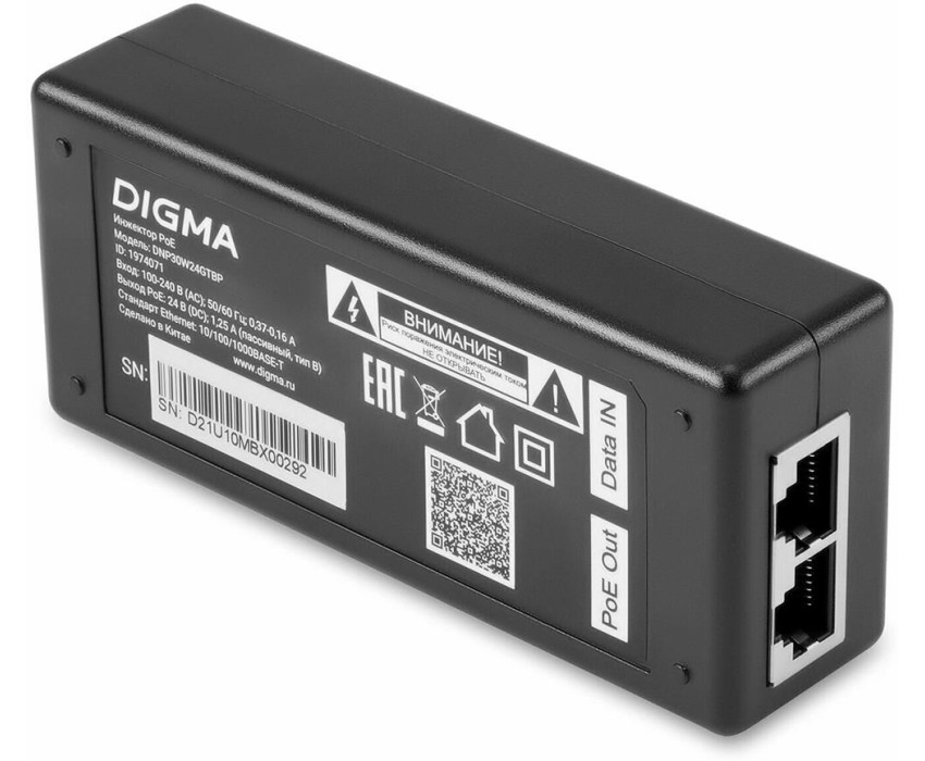 DIGMA Инжектор PoE DNP30W24GTBP 10/100/1000BASE-T 30Вт 100-240В (АС)