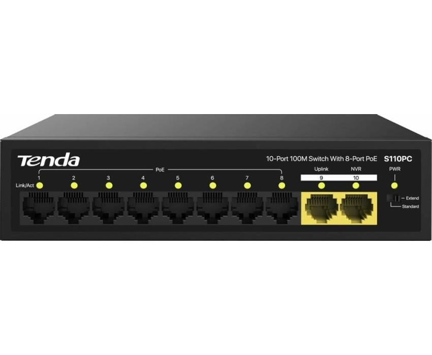 Коммутатор TENDA Коммутатор S110PC Коммутатор неуправляемый PoE, 10 портов 10x100 Мбит/с, PoE 8х до 30 Вт, настольный