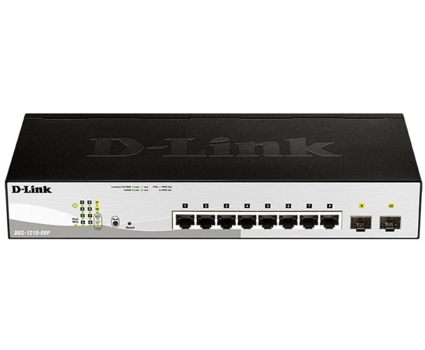 Коммутатор D-Link DGS-1210-08P/G3A Настраиваемый L2 коммутатор с 8 портами 10/100/1000Base-T и 2 портами 1000Base-X SFP (8 портов PoE 802.3af/at, PoE-бюджет 65 Вт)