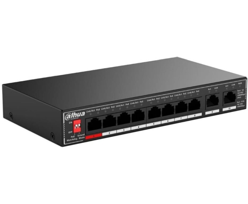 **Коммутатор Dahua 10-port Gigabit RJ45 8-port PoE Switch, 96W, Metal case** Обеспечьте стабильное и высокоскоростное сетевое соединение с коммутатором Dahua! Устройство идеально подойдёт для создания надёжной сетевой инфраструктуры в офисе, на предприятии или в домашней сети. **Основные характеристики:** * 10 портов Gigabit RJ45 для быстрого обмена данными; * 8 портов с поддержкой PoE (Power over Ethernet), что позволяет подавать электропитание на устройства через сетевой кабель — удобно для IP-камер, беспроводных точек доступа и другого оборудования; * общая мощность PoE — 96 Вт, что обеспечивает достаточное питание для подключённых устройств; * прочный металлический корпус, который надёжно защищает устройство от механических повреждений и способствует эффективному отводу тепла. С коммутатором Dahua вы получите: * высокую скорость передачи данных; * возможность упростить сетевую инфраструктуру и сократить количество кабелей; * надёжную работу подключённых устройств; * долговечность и устойчивость к внешним воздействиям благодаря качественному корпусу. Выберите коммутатор Dahua для построения современной и эффективной сетевой системы!