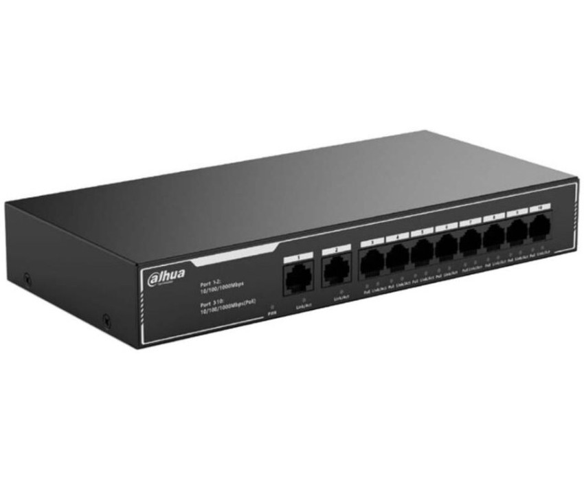 **Коммутатор Dahua 10-port Gigabit RJ45 8-port PoE Switch, 65W, Metal case** Обеспечьте надёжное и высокоскоростное подключение сетевых устройств с коммутатором Dahua! Устройство идеально подойдёт для создания стабильной сетевой инфраструктуры в офисе, на предприятии или в домашней сети. **Основные характеристики:** * 10 портов Gigabit RJ45 для быстрого обмена данными; * 8 портов с поддержкой PoE (Power over Ethernet), что позволяет подавать электропитание на устройства через сетевой кабель — это упрощает развёртывание сети и сокращает количество необходимых кабелей; * мощность PoE — 65 Вт, что достаточно для питания множества устройств, таких как IP-камеры, Wi-Fi точки доступа и другие сетевые устройства; * прочный металлический корпус, который обеспечивает долговечность и надёжную защиту устройства от повреждений. С коммутатором Dahua вы получите: * высокую скорость передачи данных; * удобство развёртывания и масштабирования сети; * надёжную работу сетевых устройств; * компактное и прочное решение для вашей сетевой инфраструктуры. Выберите коммутатор Dahua и обеспечьте стабильное и высокоскоростное подключение всех ваших устройств!