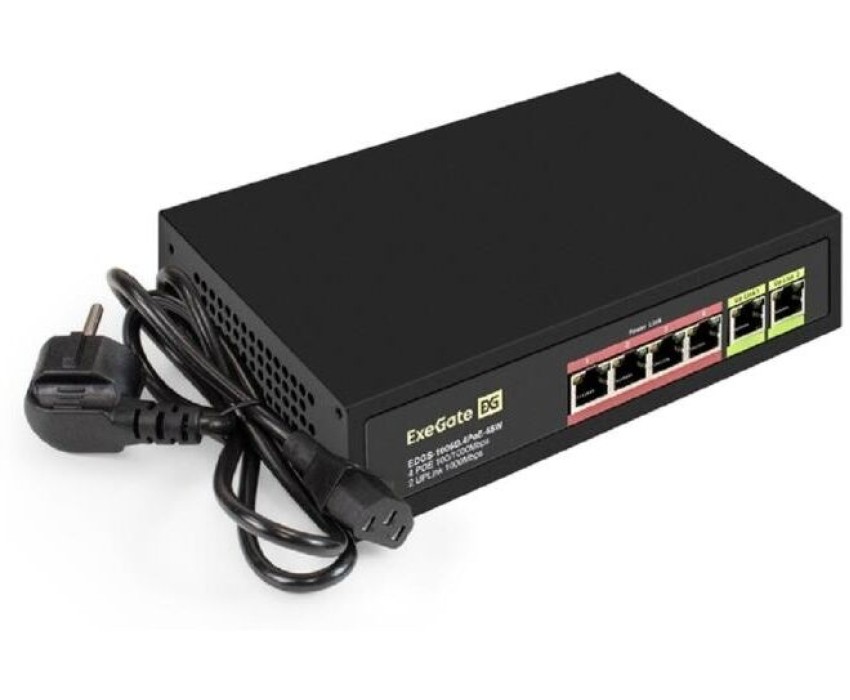 Коммутатор неуправляемый ExeGate EDGS-1006D.4PoE-65W (6-портовый гигабитный UTP 10/100/1000 Base-T: 4 порта IEEE 802.3af (PoE), мощность PoE: 15,4W, суммарно 65W, 2 порта RJ45 uplink, настенный/настольный, металлический корпус)