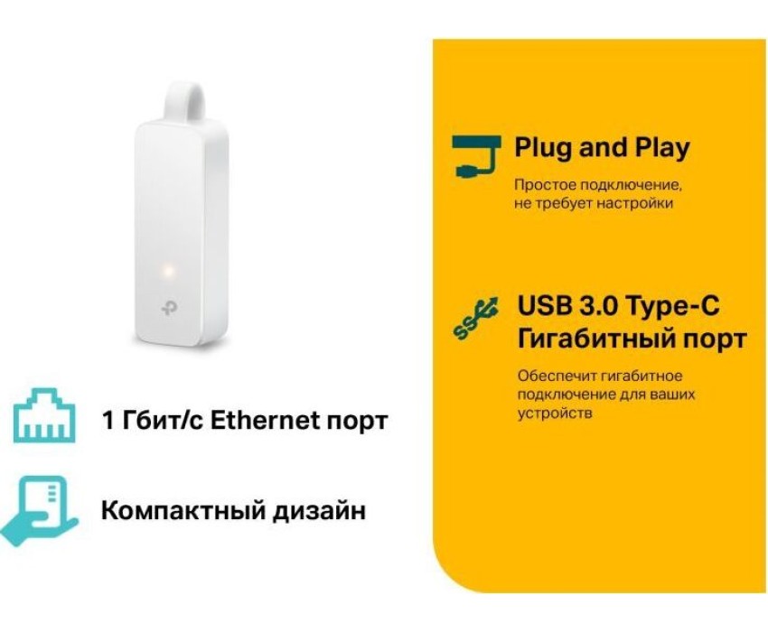 Сетевой адаптер USB Type C/Gigabit Ethernet TP-LINK UE300C Отличное решение для подключения ноутбуков, планшетов и других устройств с разъёмом USB Type-C к проводной сети. Высокоскоростное решение USB 3.0/Gigabit Ethernet обеспечивает передачу данных со скоростью до 1 Гбит/с. Поддержка Plug and Play для Windows 10, Mac OS X (10.9 и новее), Chrome OS и Linux OS. Складной портативный дизайн идеально подходит для ноутбуков типа Ultrabook Интернет-подключение по кабелю для устройств USB-C Создайте мгновенный скоростной доступ к проводной сети для ноутбука, планшета, компьютера и других устройств с разъёмом USB Type-C. Гигабитное подключение UE300C оборудован портами USB 3.0 и Gigabit Ethernet, а также поддерживает скорость передачи данных до 1 Гбит/с, благодаря чему он идеально справляется с передачей больших файлов, стримами, онлайн-играми и не только. Складной портативный корпус Вес: 20 г Размеры: 71 ? 26 ? 16,2 мм Характеристики Тип: Сетевой адаптер Интерфейс: USB Type C Скорость: 10/10