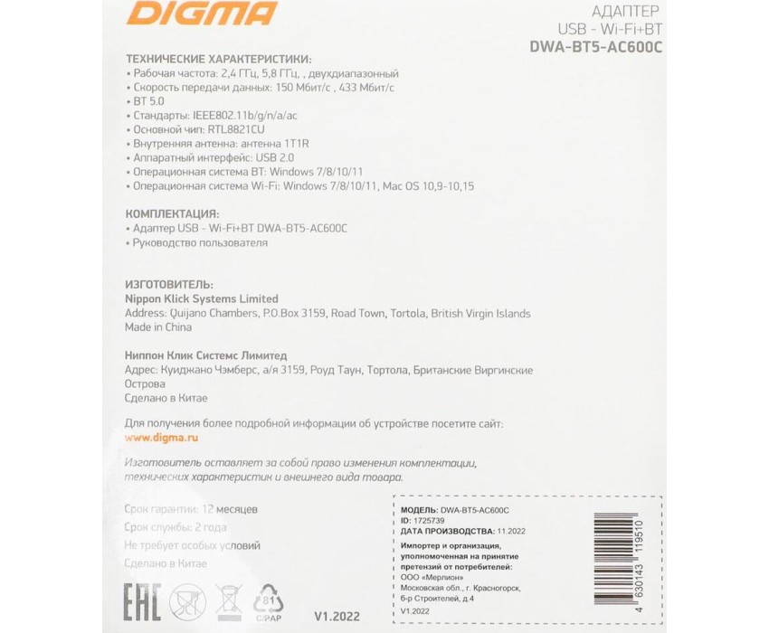 DIGMA DWA-BT5-AC600C