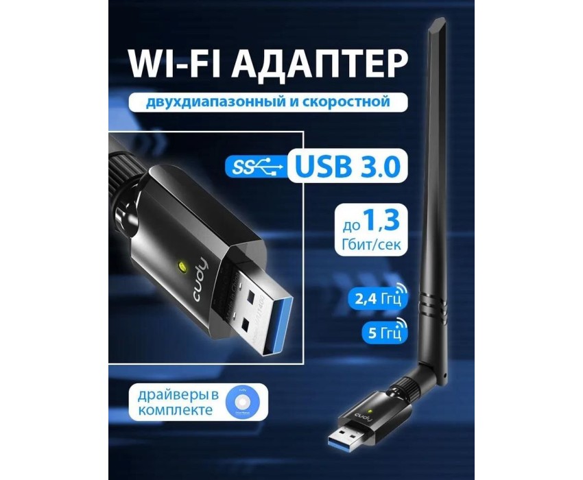 Wi-Fi USB 3.0 Адаптер AC1300, 1300 Мбит/с с высоким коэффициентом усиления, 802.11ac/a/b/g/n, 867 Мбит/с на 5 ГГц + 400 Мбит/с на 2,4 ГГц, 1 съемная антенна с высоким коэффициентом усиления, USB 3.0