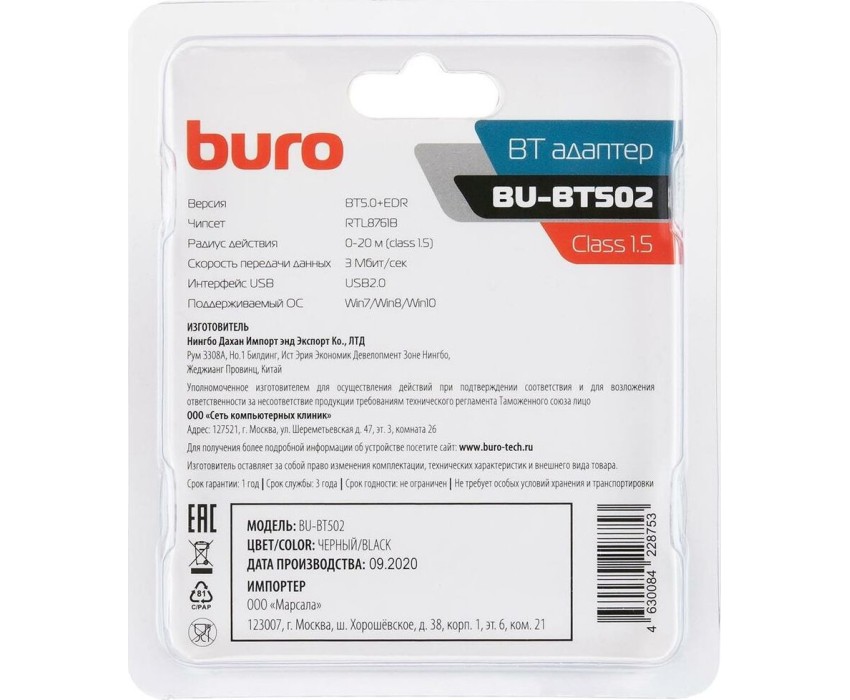 Бренд BURO Модель BU-BT502 Подключение USB Интерфейс USB USB2.0 Чипсет RTL8761B Стандарт Bluetooth Bluetooth 5.0+EDR Класс Bluetooth class 1.5 Скорость передачи данных 3 Мбит/с Радиус действия 20 м Поддерживаемые ОС Win7/Win8/Win10 Поставка Ret Цвет черный