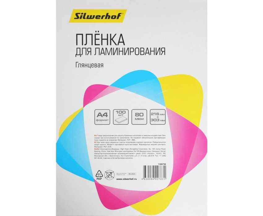 SILWERHOF Пленка для ламинирования 80мкм A4 (100шт) глянцевая 216x303мм (4410019)