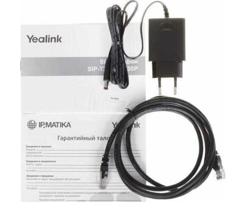 IP-телефон, шнур для подключения трубки RJ9, сетевой кабель Ethernet 1.5 м, подставка, телефонная трубка, гарантийный талон, краткое руководство, адаптер питания (вход AC 100~240V; выход DC 5V, 0.6А)