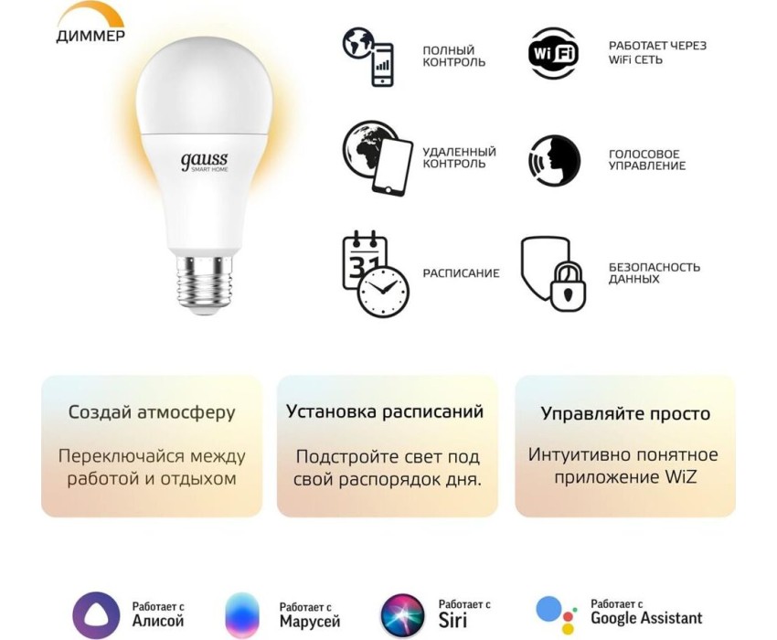 Рабочая температура: от 0 до +45. Возможности: Изменение яркости голосом или с помощью мобильного приложения. Требования: Мобильное приложение WiZ. Поддержка операционных систем: Android 4.4 и выше, iOS 12.0 и выше. Вес: 160. Напряжение: 220-240В. Передача данных по Wi-Fi: ДА. Стандарт Wi-Fi: 802.11 b/g/n. Цоколь лампы: E27. Срок службы лампы (при 50% яркости): 15000. Энергопотребление: 10. Угол свечения лампы: 180. Светосила: 1055. Тип: Умная лампа. Тип питания: от электросети. Регулировка яркости света (диммируемая): да. Вид лампы: вкручиваемая. Габариты упаковки (ед) ДхШхВ: 0.105x0.075x0.13. Вес упаковки (ед): 0.35. Типы беспроводного подключения: Wi-Fi. Часть умного дома: да. Гарантия: 24 мес.. Размеры (ШхВхГ): 102 х 72 х 130 мм. Цветовая температура: 2700 К. Экосистема: Apple HomeKit, Google, VK, Яндекс. Совместимость с голосовыми помощниками: Google Assistant, Siri, Алиса, Маруся. Цветовая температура: 2700 К. Передача данных: по Wi-Fi. Срок службы лампы: 15000 ч(при 50% яркости). Цоколь: E27. Светосила: 1055 lm. Работает с: Google Assistant, Siri, Алиса, Маруся