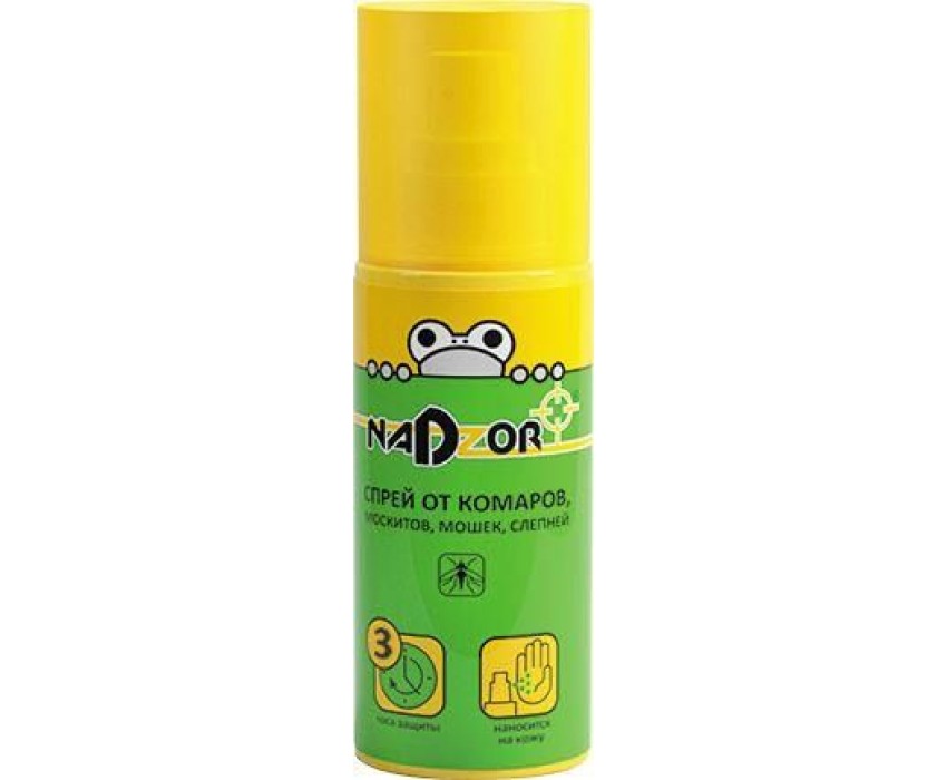 Средство обладает широким спектром репеллентного действия в отношении кровососущих насекомых (комаров, мокрецов, мошек и москитов). При распылении спрея от Nadzor молекулы действующего вещества - ДЭТА образуют на коже паровой барьер. N, N-диэтилтолуамид также влияет на нейроны и рецепторы комаров, которыми они обнаруживают такие химические вещества, как молочная кислота и углекислый газ, поэтому кровососущим насекомым не удается сесть на человека и укусить его.