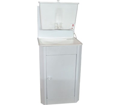 Умывальник с ЭВН плас.мойка/плас.бак разборный, цвет белый Габариты 420х500*1135, С водонагревателем Мойка-пластик. Бак-пластик-17л Мощность нагревателя – 1,25 кВт (при достижении 60 градусов атоматически отключается) Размер бака: 345х480х100 (высота, ширина, глубина) Задняя стенка бака: 740х480х380 Размер тумбы: 740х480х380