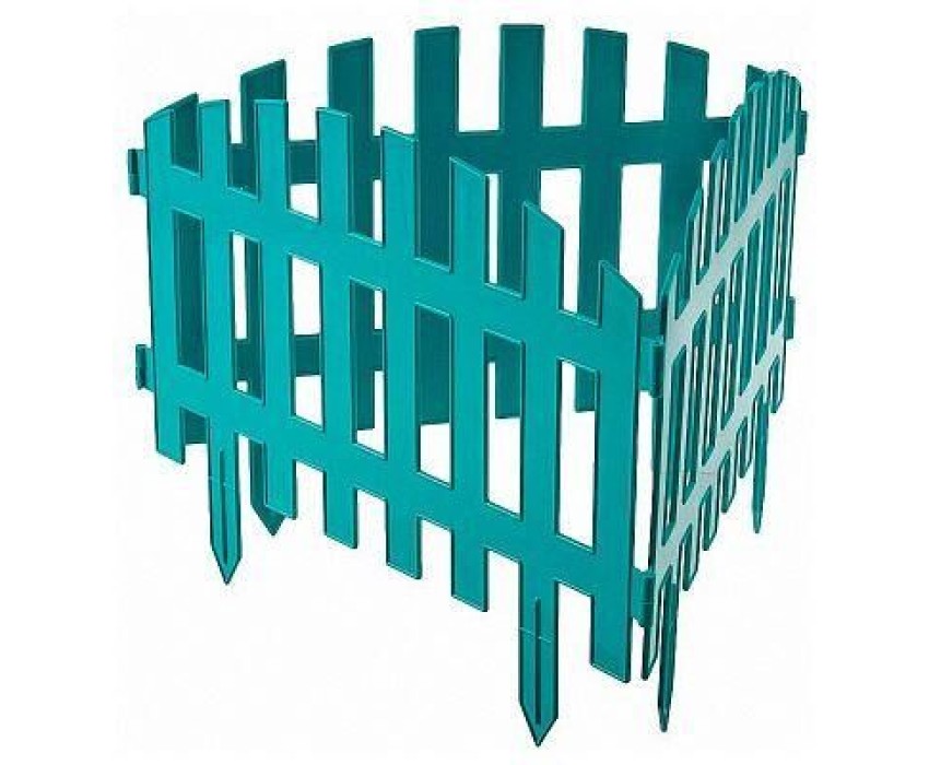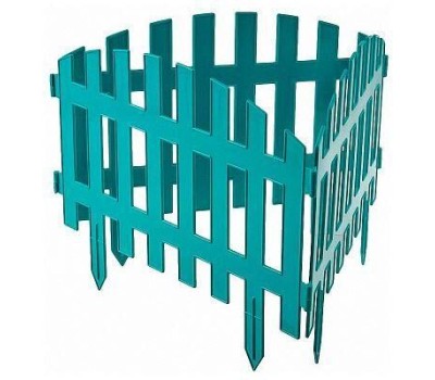 Материал: полипропилен Размер 1 секции: 35*45*0,5 см. Длина комплекта 2,25 м Индивидуальная упаковка: термопленка с цветной этикеткой и стикером Цвет - бирюза. Используется для ограждения клумбы, зоны отдыха и проч на садовых участках.