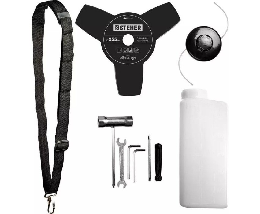 Коса бензиновая - 1 шт. Велосипедная рукоятка - 1 шт. Кожух защитный - 1 шт. Нож - 1 шт. Катушка с леской - 1 шт. Ключ (свечной, гаечный, имбусовый) - 3 шт. Фиксатор вала - 1 шт. Плечевой ремень - 1 шт. Емкость для смешивания - 1 шт. Руководство по эксплуатации - 1 экз.