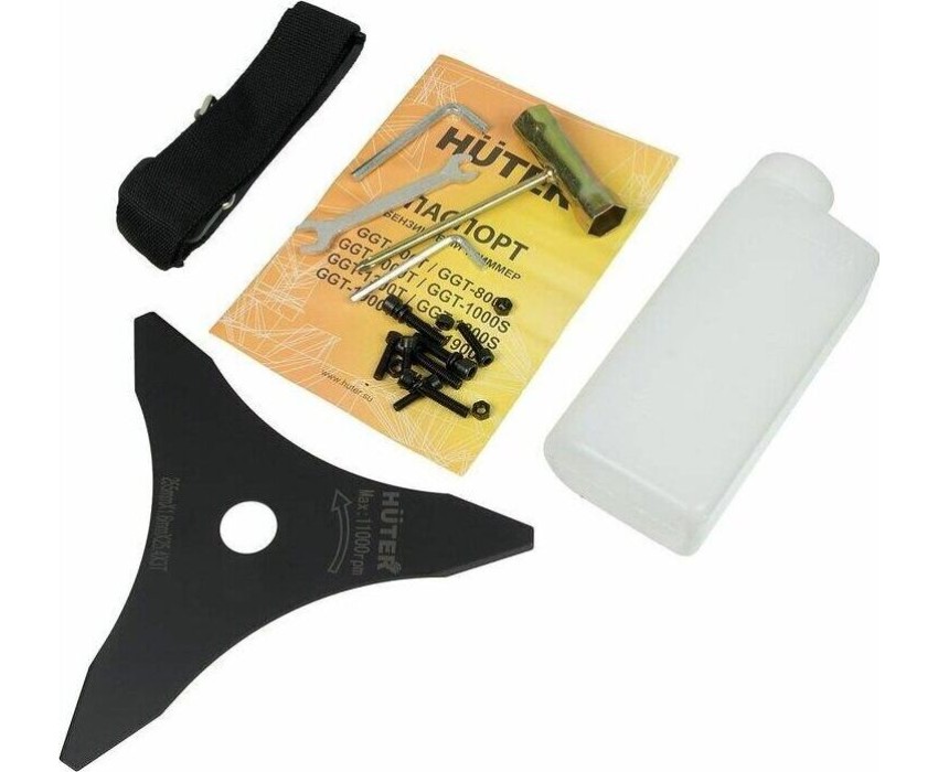 Двигатель в сборе — 1 шт. Штанга в сборе с редуктором — 1 шт. Защитный кожух — 1 шт. Режущий диск — 1 шт. Катушка с леской — 1 шт. Рукоятки управления (левая и правая) — 1 шт. Ранцевый ремень/ Наплечный ремень — 1 шт. Комплект ключей – 1 шт. Паспорт продукции — 1 шт. Защитные очки - 1 шт.