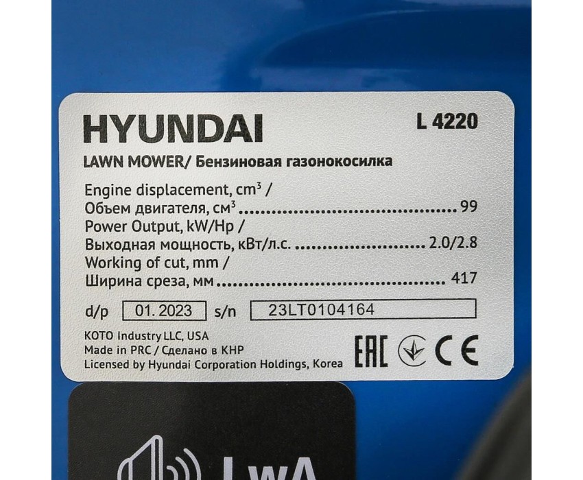 Выходная мощность, л.с. 2.8. Количество лопастей режущего ножа 2. Мульчирование Да. Ширина среза, см 41,7. Высота среза максимальная, мм 70. Наличие привода движения нет. Модель двигателя Hyundai ICV100. Регулировка высоты кошения Центральная. Материал корпуса Сталь. Объем травосборника, л 45. Вес, кг 19. Боковой выброс нет. Высота среза минимальная, мм 20. Уровень звуковой мощности, дБ (А) Lwa 96. Объем двигателя, см3 99.8. Емкость топливного бака, л 0.9. Диаметр колес передние/задние (мм) 152.4/177.8. Тип перемещения – самоходная (или не самоходная) нет. Объем картера, л 0.5.