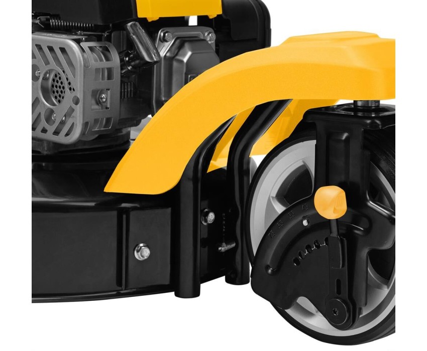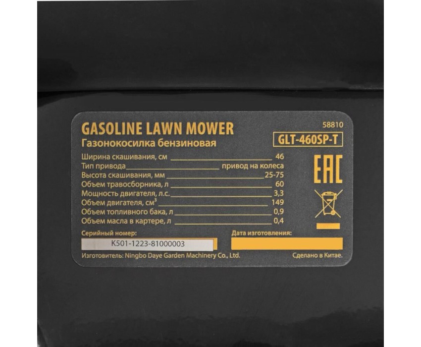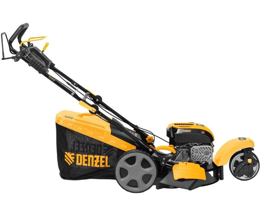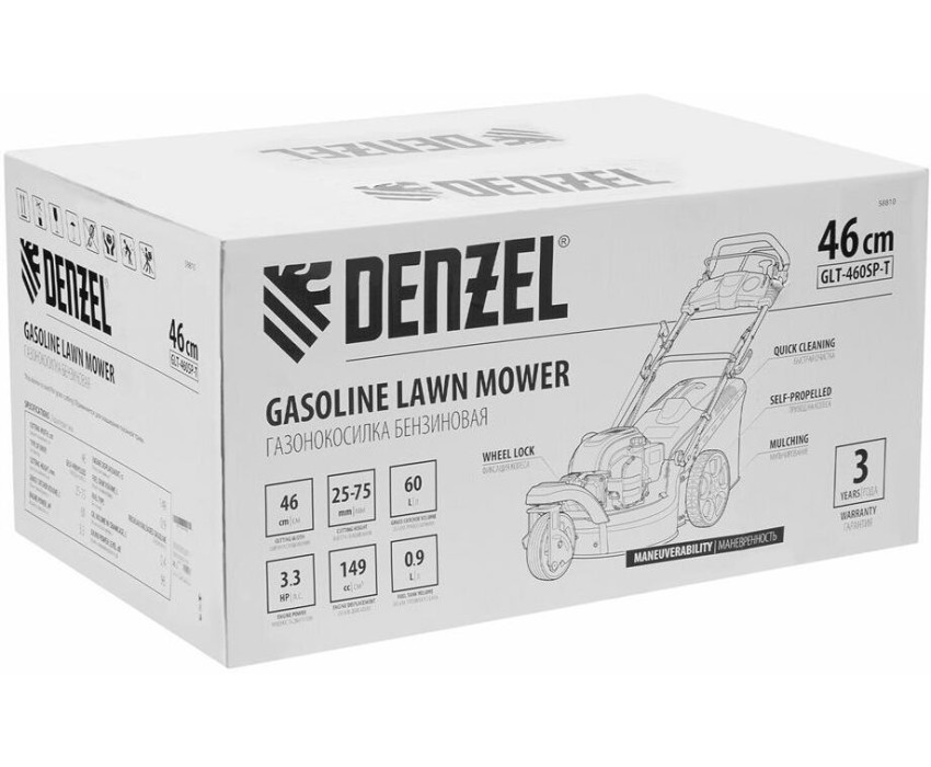 Трехколесная бензиновая газонокосилка Denzel GLT-460SP-T Trike 58810 с двигателем объемом 149 см3 и приводом на колеса, с травосборником на 60 л, обеспечивает ширину скашивания 46 см. Оптимальна для ухода за газоном на дачном участке. Позволяет установить необходимую высоту скашивания в соответствии с требованиями к травяному покрову, всего предусмотрено 6 уровней: от 25 до 75 мм. Благодаря поворотному переднему колесу модель GLT-460SP-T Trike отличается высокой маневренностью, что особенно удобно для скашивания травы между деревьями и кустами.