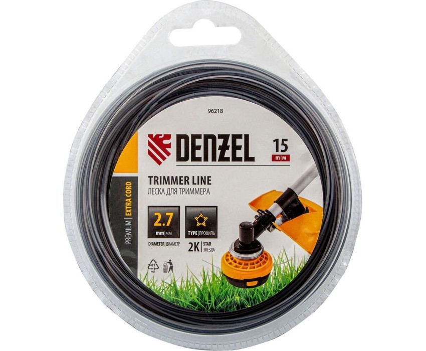 Двухкомпонентная леска для триммера Denzel EXTRA CORD 96218 с сечением «звезда», диаметром 2,7 мм и длиной 15 м, в блистере, предназначена для скашивания крупностеблевой растительности. Позволяет эффективно справляться с работой даже на замусоренной территории. Используется на бензиновых триммерах с объемом двигателя 2552 см3 и электрических триммерах мощностью от 1 до 1,5 кВт.ПреимуществаПрочность — леска изготовлена из полиамида РА6 с добавлением полиамида BASF.Повышенная стойкость к нагрузкам — благодаря прочному нейлоновому сердечнику в эластичной оболочке значительно снижен риск повреждения и обламывания лески при соприкосновении с твердыми предметами, такими как камни.Высокая скорость работы — благодаря сечению «звезда» трава срезается быстро и ровно.Экономичность — корда длиной 15 м хватит на длительный срок.