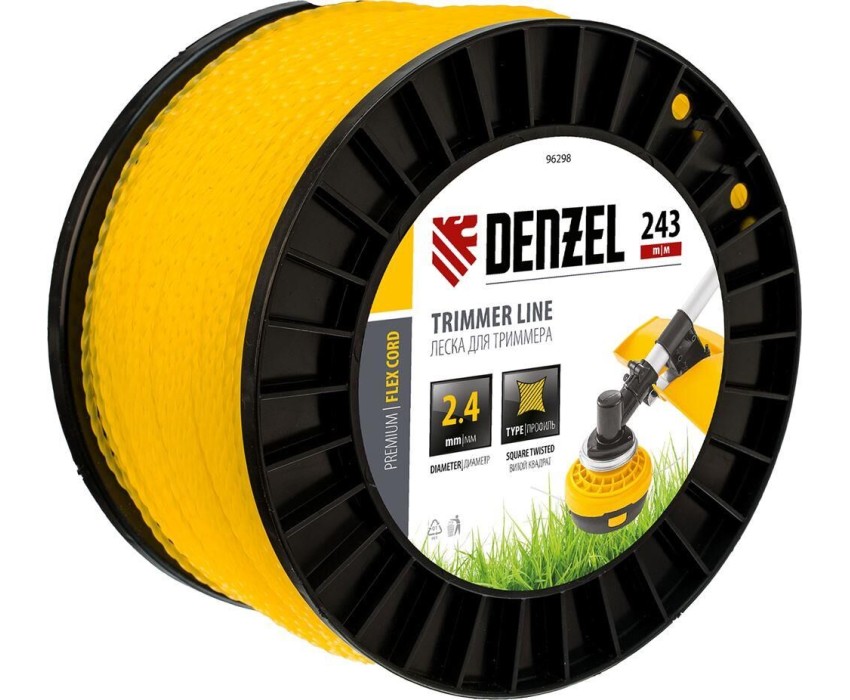 Леска для триммера Denzel FLEX CORD 96298 с сечением витой квадрат, толщиной 2,4 мм и длиной 243 м, на DIN-катушке, предназначена для скашивания крупностеблевой растительности. Используется на бензиновых триммерах с объемом двигателя 25-52 см3 и электротриммерах мощностью от 1 до 1,5 кВт.ПреимуществаПрочность и долговечность леска изготовлена из полиамида РА6 с добавлением полиамида BASF.Высокая скорость работы леска с острыми гранями производит агрессивный рез, быстро скашивая траву.Комфортное использование за счет сечения витой квадрат корд обладает хорошей эластичностью и его удобно наматывать на катушку.Длина 243 м запаса хватит на длительный срок.Удобное хранение и транспортировка корд не размотается, если его концы закрепить в специальных отверстиях DIN-катушки.