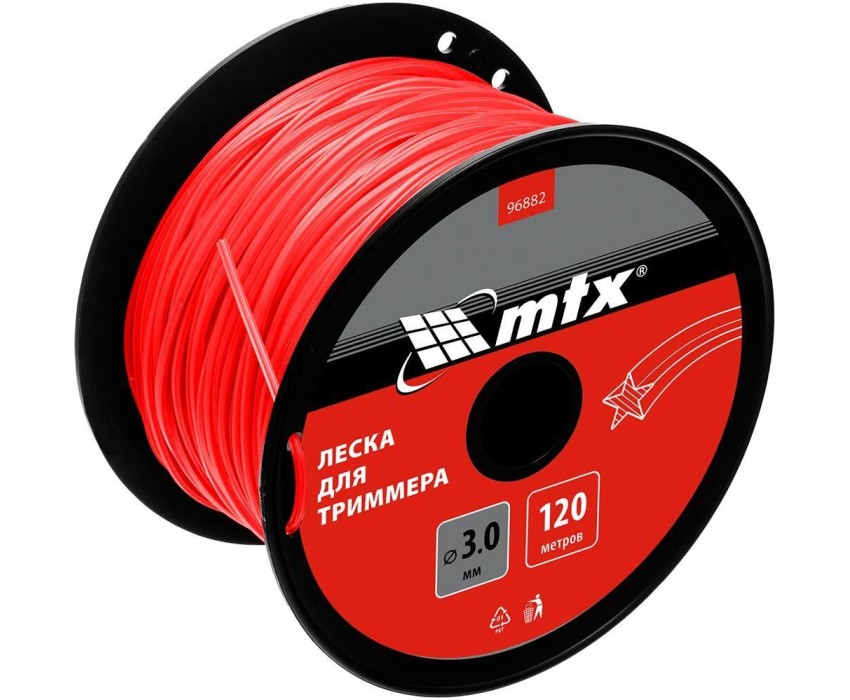 Леска для триммера MTX 96882 с сечением «звезда», толщиной 3,0 мм и длиной 120 м, поставляется на катушке и позволяет скашивать мягкую, молодую траву, а также густую и жесткую растительность. С ее помощью можно справляться с сорняками, сухой травой и побегами кустарников. Леска используется в качестве режущего элемента для бензиновых триммеров. Пригодится на дачном участке, а также для ухода за газонами на придомовой территории, в скверах и т.д. Преимущества Долговечность — леска из прочного полиамида PA6 отличается износостойкостью. Сечение «звезда» — корд с острыми гранями быстро срезает траву, обеспечивает ровный срез и позволяет выполнять больший объем работ, не увеличивая нагрузку на двигатель триммера. Удобное хранение и транспортировка — леска намотана на катушку со специальными отверстиями, в которых можно закрепить кончики корда. Длина 120 м — одной намотки хватит для выполнения большого объема работ.