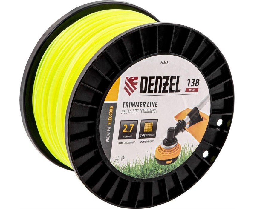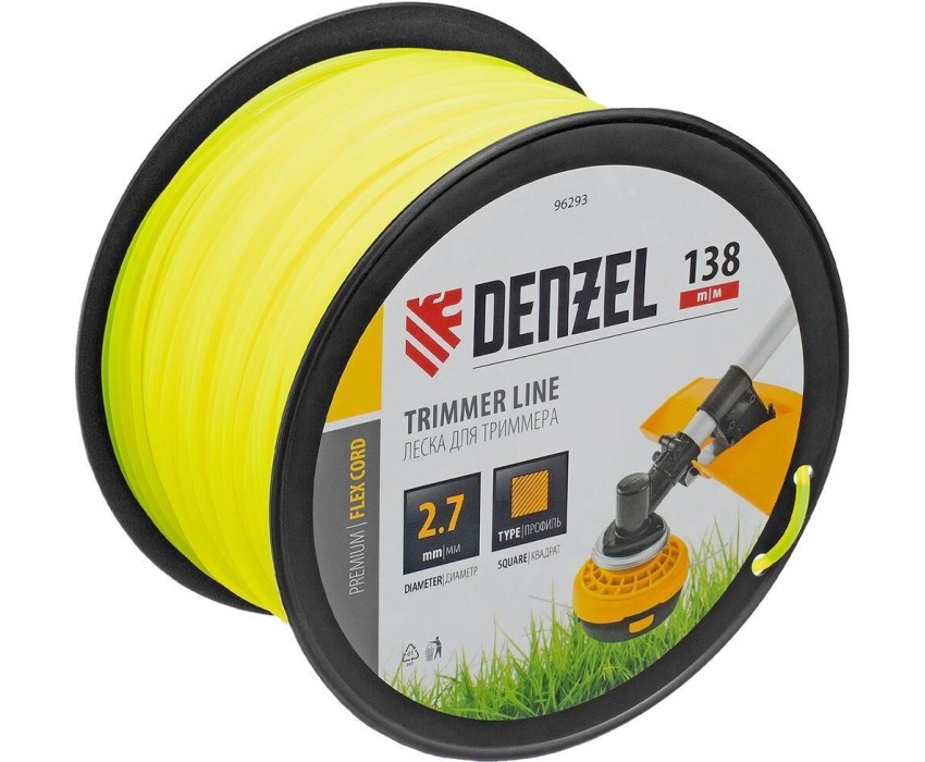 Леска для триммера Denzel FLEX CORD 96293 с сечением «квадрат», толщиной 2,7 мм и длиной 138 м, на DIN-катушке, предназначена для скашивания крупностеблевой растительности. Заправляется в катушку бензотриммеров с объемом двигателя 25-52 см3 и электротриммеров мощностью от 1 до 1,5 кВт.ПреимуществаНадежность — квадратное сечение и толщина корда увеличивают устойчивость корда к излому.Прочность — леска изготовлена из полиамида РА6 с добавлением полиамида BASF.Высокая производительность — благодаря острым граням леска быстро срезает траву.Длина 138 м — корда хватит для выполнения большого объема работ.Удобное хранение и транспортировка — концы лески можно закрепить в отверстиях DIN-катушки.
