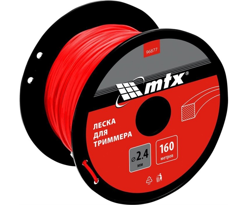 Леска для триммера MTX 96877 квадратного сечения, толщиной 2,4 мм и длиной 160 м, поставляется на катушке и позволяет скашивать мягкую, молодую траву, а также густую и жесткую растительность. Используется в качестве режущего элемента для бензиновых триммеров. Пригодится на дачном участке, а также для ухода за газонами на придомовой территории, в скверах и т.д. Преимущества Долговечность — леска из прочного полиамида PA6 отличается износостойкостью. Квадратное сечение — корд с острыми гранями обеспечивает ровный срез, трава не желтеет после скашивания. Удобное хранение и транспортировка — леска намотана на катушку со специальными отверстиями, в которых можно закрепить кончики корда. Длина 160 м — одной намотки хватит для выполнения большого объема работ.