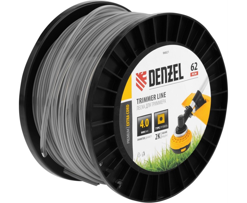 Двухкомпонентная леска для триммера Denzel EXTRA CORD 96821 размером 4,0 мм х 62 м, с сечением «квадрат», на DIN-катушке, используется для скашивания густых зарослей травы и сорных растений на дачном участке и придомовой территории. Заправляется в катушку мощных бензотриммеров. Благодаря острым граням леска успешно справляется с толстыми, жесткими стеблями, позволяя быстро обработать участок большой площади.ПреимуществаПрочность — леска изготовлена из полиамида PA6 с использованием сырья производства компании BASF — признанного лидера мировой химической промышленности.Высокий ресурс — леска имеет прочный сердечник и эластичный внешний слой, что более чем на 50% увеличивает устойчивость к повреждениям и обрыву.Экономичность — длины 62 м достаточно для выполнения большого объема работ.Удобная упаковка — концы корда закрепляются в отверстиях DIN-катушки, чтобы сохранить целостность намотки во время хранения и транспортировки.
