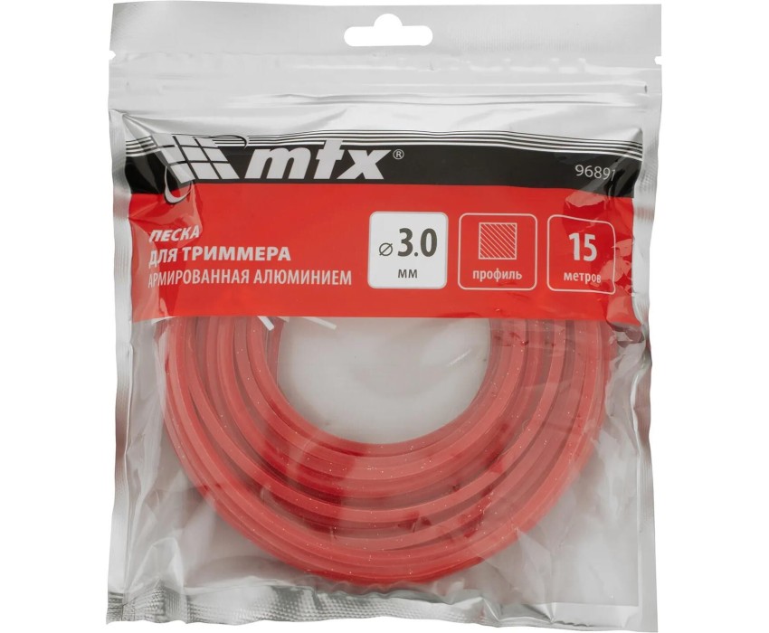 Леска для триммера MTX 96891 с сечением «квадрат», толщиной 3,0 мм и длиной 15 м, армированная алюминием, эффективно срезает как газонную, так и высокую, жесткую или сухую траву.