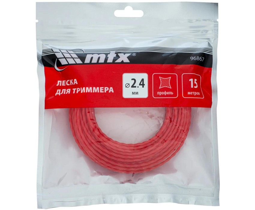 Леска для триммера MTX 96867 с сечением «витой квадрат», толщиной 2,4 мм и длиной 15 м, позволяет быстро и эффективно скашивать газонную, а также высокую и жесткую траву.