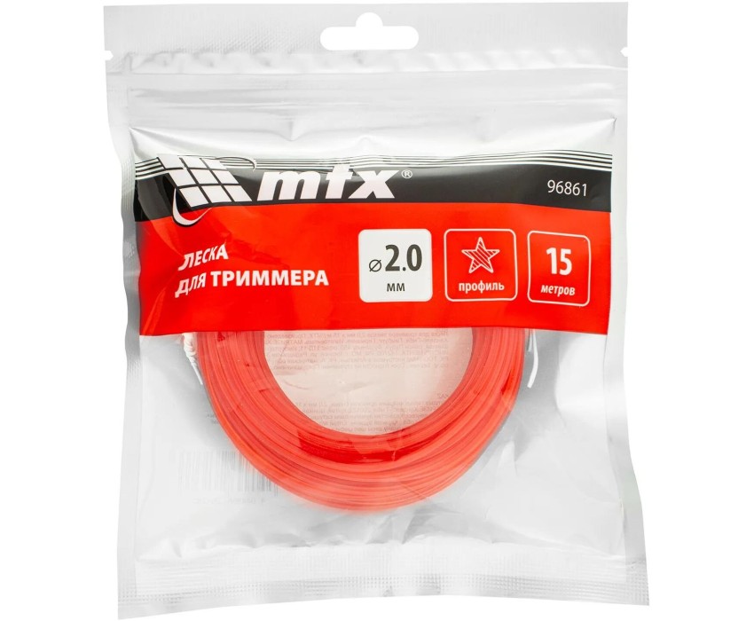 Леска для триммера MTX 96861 с сечением «звезда», толщиной 2,0 мм и длиной 15 м, подходит для скашивания как мягкой газонной, так и жесткой травы.