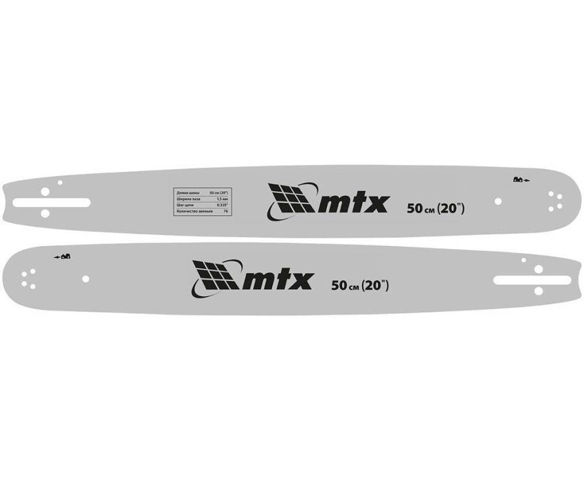 Шина MTX 59818 длиной 50 см (20?), с шириной паза 1,5 мм, — элемент пильной гарнитуры для бензопилы. Подходит для распиливания древесины мягкой и средней жесткости, оптимальна для для полупрофессиональных целей: валки деревьев, частного строительства, заготовки большого количества дров, срезания толстых веток в саду. На шину надевается цепь с 76 звеньями (шаг 0,325?), позволяющая формировать аккуратные надпилы и срезы. Преимущества Устойчивость к деформациям и ударным нагрузкам — шина изготовлена из прочной конструкционной стали 50. Антикоррозионные свойства — защитное порошковое покрытие предотвращает разрушение шины. Корректная работа без заклинивания — ведущая звездочка отличается надежностью и обеспечивает точную передачу крутящего момента к цепи. Продуманная конструкция — технологические отверстия обеспечивают равномерную подачу масла к цепи, такое решение увеличивает срок службы пильной фурнитуры и защищает двигатель пилы от перегрева. Удобная эксплуатация — благодаря шагу цепи 0,325? шина работает практически без вибраций.