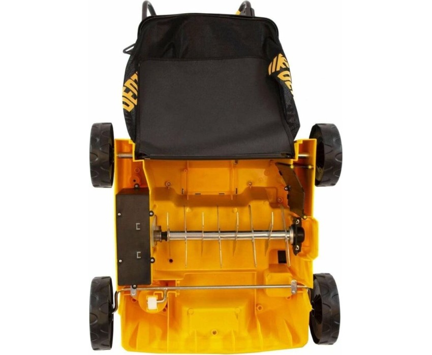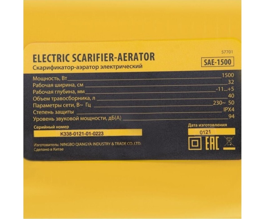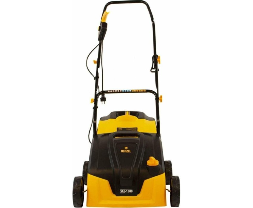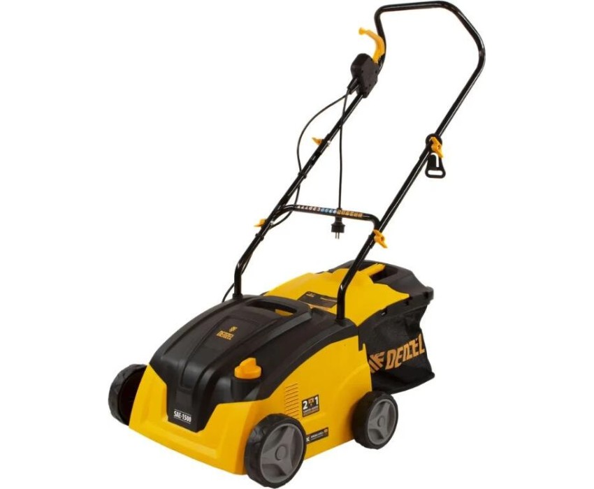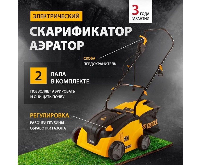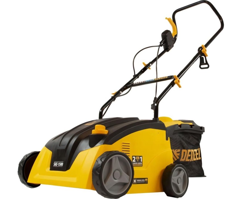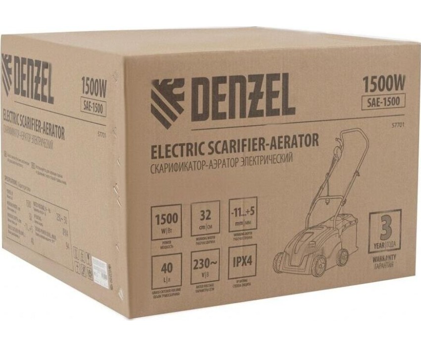 Электрический скарификатораэратор Denzel SAE1500 57701 мощностью 1500 Вт обеспечивает ширину обработки 32 см, глубину 11/+5 мм и предназначен для ухода за газоном: удаления сухой травы, мха и мусора, а также прорезания дерна и обеспечения притока воздуха к корневой системе растений. Скорость вращения вала составляет 4000 об/мин, этого достаточно для эффективной обработки придомовой территории.ПреимуществаЭффективность и долговечность — 16 острых ножей тщательно разрыхляют грунт и обеспечивают доступ воздуха к корневой системе растений, не нуждаются в частой заточке.Защита от перегрева — двигатель стабильно работает даже при длительном интенсивном использовании.Безопасность пользователя — блокиратор включения предотвращает случайный запуск скарификаторааэратора.Травосборник на 40 л — благодаря сочетанию твердого каркаса и мягкой ткани его легко устанавливать, а также просто опустошать и чистить.Зажим для сетевого кабеля — шнур не попадает под ножи во время работы.