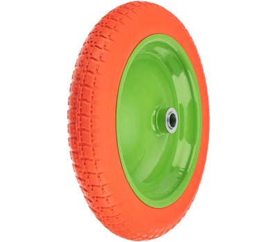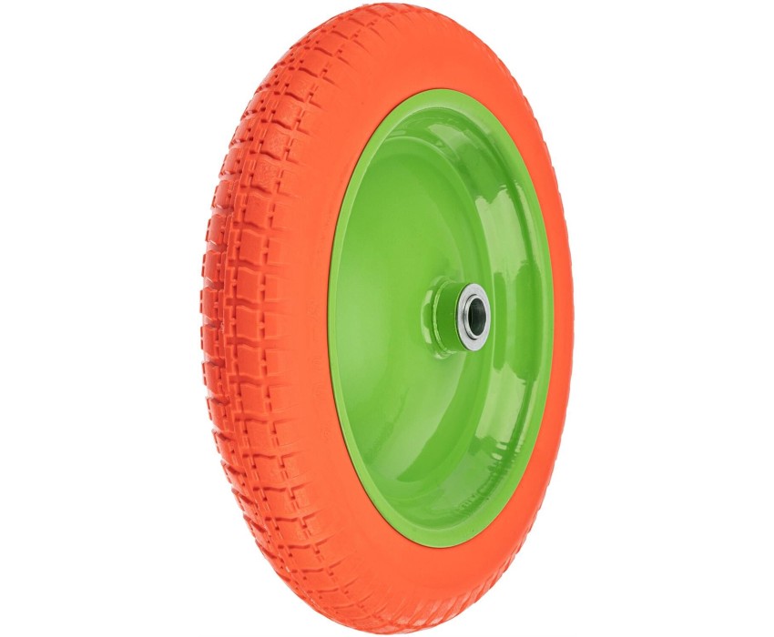 Полиуретановое колесо 3.00-8 Сибртех 689765 с длиной оси 90 мм и диаметром подшипника 20 мм — движущий элемент тачек Palisad 68923, 689233, 68937, Сибртех 689643 и др. Непрокалываемое колесо подходит для использования в самых жестких условиях. В отличие от пневматических колес не требует подкачки, обслуживания и легко отмывается от грязи. Преимущества Плавный ход — колесо с глубоким протектором обладает высокими амортизирующими свойствами. Прочность — стальной диск имеет сплошной сварной шов по всей окружности, ось надежно фиксируется в ступице благодаря стальным подшипникам. Высокий ресурс — полиуретановое колесо не разрушается от воздействия влаги, солнечных лучей, бензина и масла, обладает повышенной стойкостью к проколам и выдерживает температуру -50 до + 50 ℃.