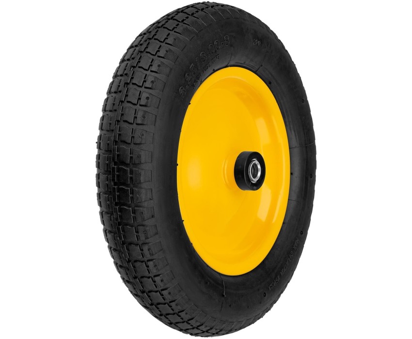 Пневматическое колесо 3.25/3.00-8 Palisad 68943 диаметром 360 мм, с длиной оси 94 мм и внутренним диаметром подшипника 16 мм, предназначено для перевозки грузов с помощью тачки. Подходит к тачкам Palisad 689155, 689225, 689695, Сибртех 689635 и др. Колесо с шариковыми подшипниками обеспечивает высокую проходимость и рассчитано на ежедневное использование на ровном или рыхлом грунте. Преимущества Надежность и коррозионная стойкость — стальной диск изготовлен методом точечной сваркой половинок по всей окружности и покрыт порошковой краской. Бесшумное и безопасное перемещение — резиновая шина не портит напольное покрытие и двигается очень тихо. Комфортная работа — пневматическое колесо эффективно поглощает вибрации даже при полной загрузке тачки.