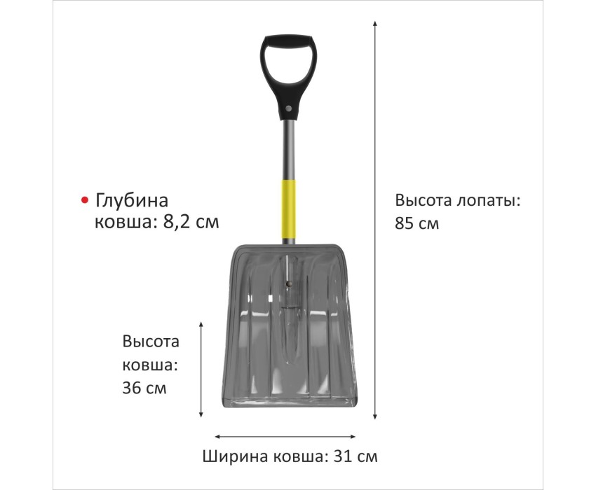 Фиксируется в глубоком пазу на ковше. Благодаря оптимальной длине (85 см) и небольшому весу (1 кг) автомобильная лопата удобна в использовании. Эргономичная D-образная рукоять обеспечивает комфортный хват и удобство хранения на крючке. Неломающийся ковш из поликарбоната увеличенной глубины Прочный и легкий алюминиевый черенок с нескользящей накладкой Эргономичная D-образная рукоять обеспечивает удобный хват Длинна лопаты: 85 см Вес лопаты: 1 кг Габариты ковша: 31х36х8,2 см Материал ковша: поликарбонат Материал черенка: алюминий Тип рукояти: D-образный Материал рукояти: полипропилен Страна производитель: Россия