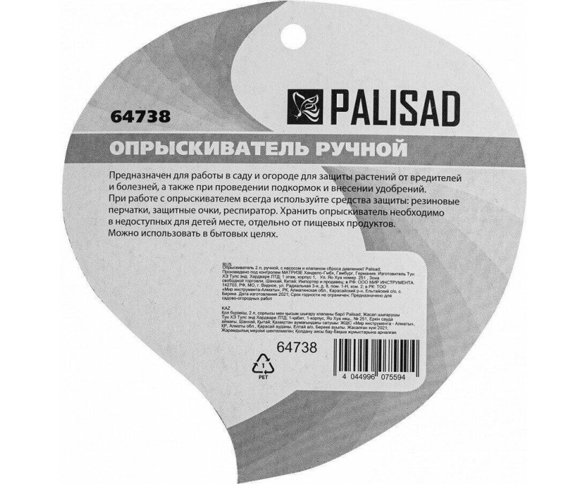Опрыскиватель PALISAD Опрыскиватель ручной, 2 л, с насосом и клапаном сброса давления 64738